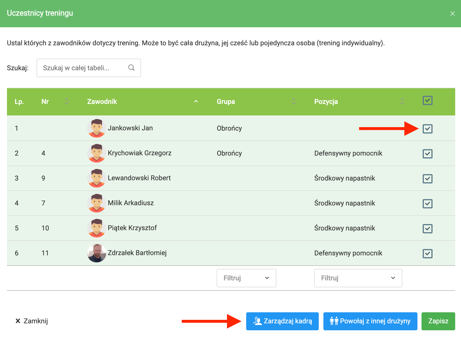 Przy okazji tworzenia treningu masz możliwość ustalenia listy uczestników treningu (zawodnicy) oraz trenerów (kadra). Zaznaczona lista zawodników będzie zbieżna z listą zawodników na liście obecności przy okazji jej sprawdzania. Lista trenerów zaznaczonych jako kadra danego treningu, będzie widoczna m.in. na konspekcie. Z tego też miejsca masz również możliwość powoływania jednorazowo zawodnika z innej drużyny na planowany trening. Powiadomienie uczestników o treningu opiera się na wyborze grup użytkowników, do których takowe ma zostać wysłane. Pojawi się ono zarówno na aplikacji mobilnej, jak i w wersji online systemu.
